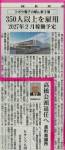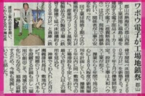 このたび、当社ワボウ電子株式会社は、福島県郡山市の郡山西部第一工業団地に新工場を建設することを発表し、9月25日に現地で地鎮祭を執り行いました。